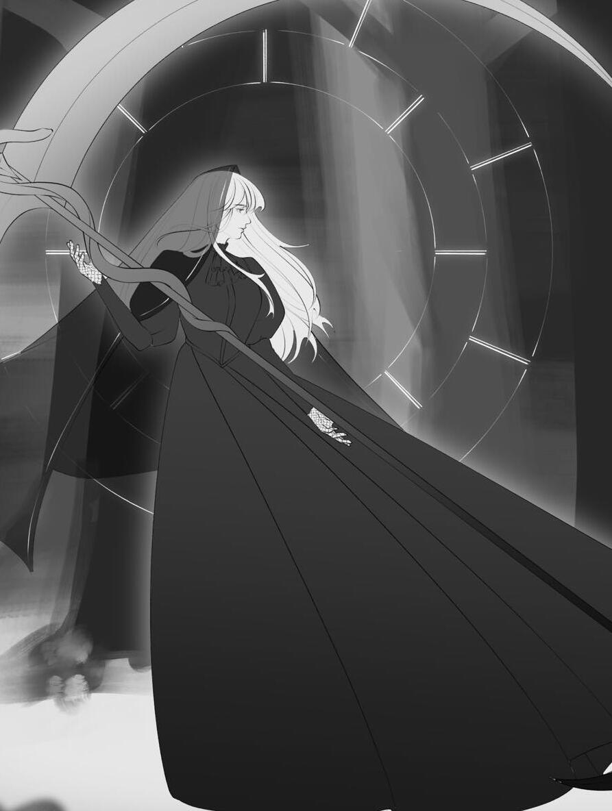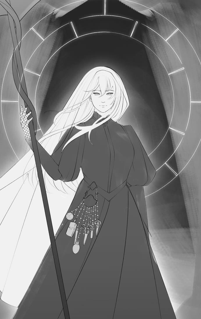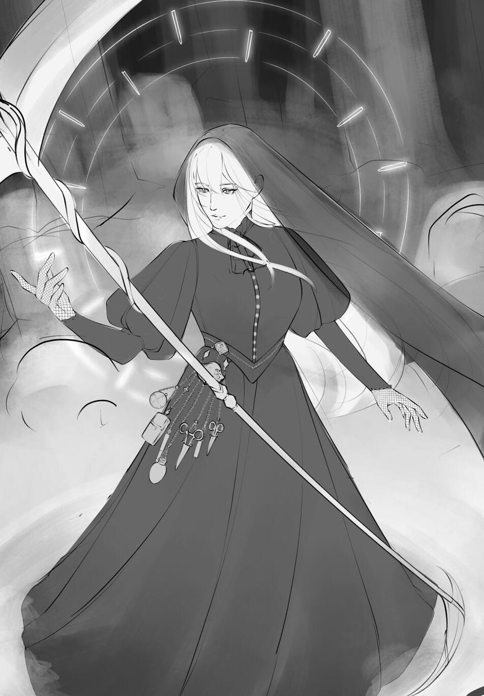 Vivian at first glance seems average, albeit eerily beautiful. Snow white hair, pale skin and striking blue eyes, all made more prominent by her habit of wearing jet black. However, looking closer you will find faint white dragon scales on her arms and across one cheek. She has the ability to use magic, but all of her spells come out as representations of her work; scythes, coffin nails, coffins, and so on.